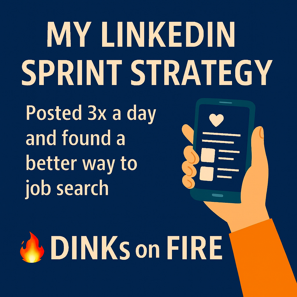 LinkedIn job search strategy, job search visibility, stop getting ghosted, how to post on LinkedIn, job seeker content ideas, LinkedIn sprint, job search burnout, DINKs on FIRE, Mrs. DINK, financial independence career, authentic job search stories, posting rhythm for LinkedIn, how to attract recruiters, rebuilding confidence after rejection, career growth through visibility, job search tips 2025
